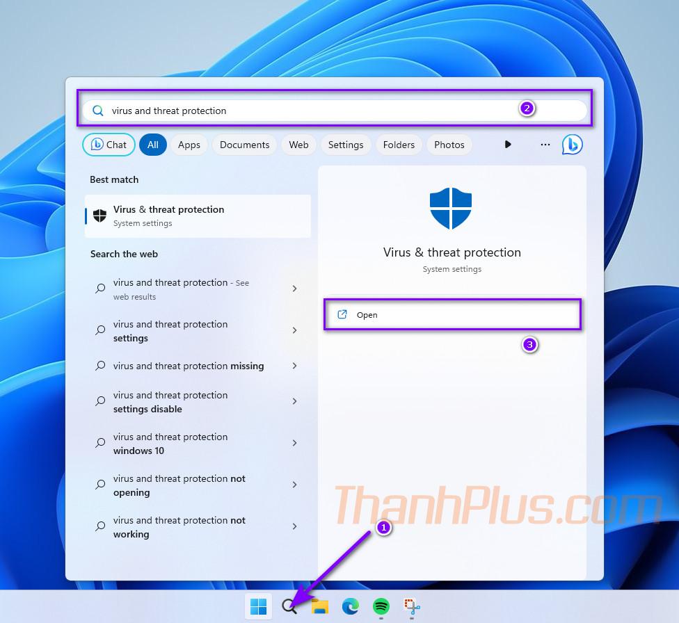 Đầu tiên bạn hãy click vào biểu tượng tìm kiếm trên Windows 11, sau đó gõ từ khóa “Virus and threat protection” và click Open để mở lên