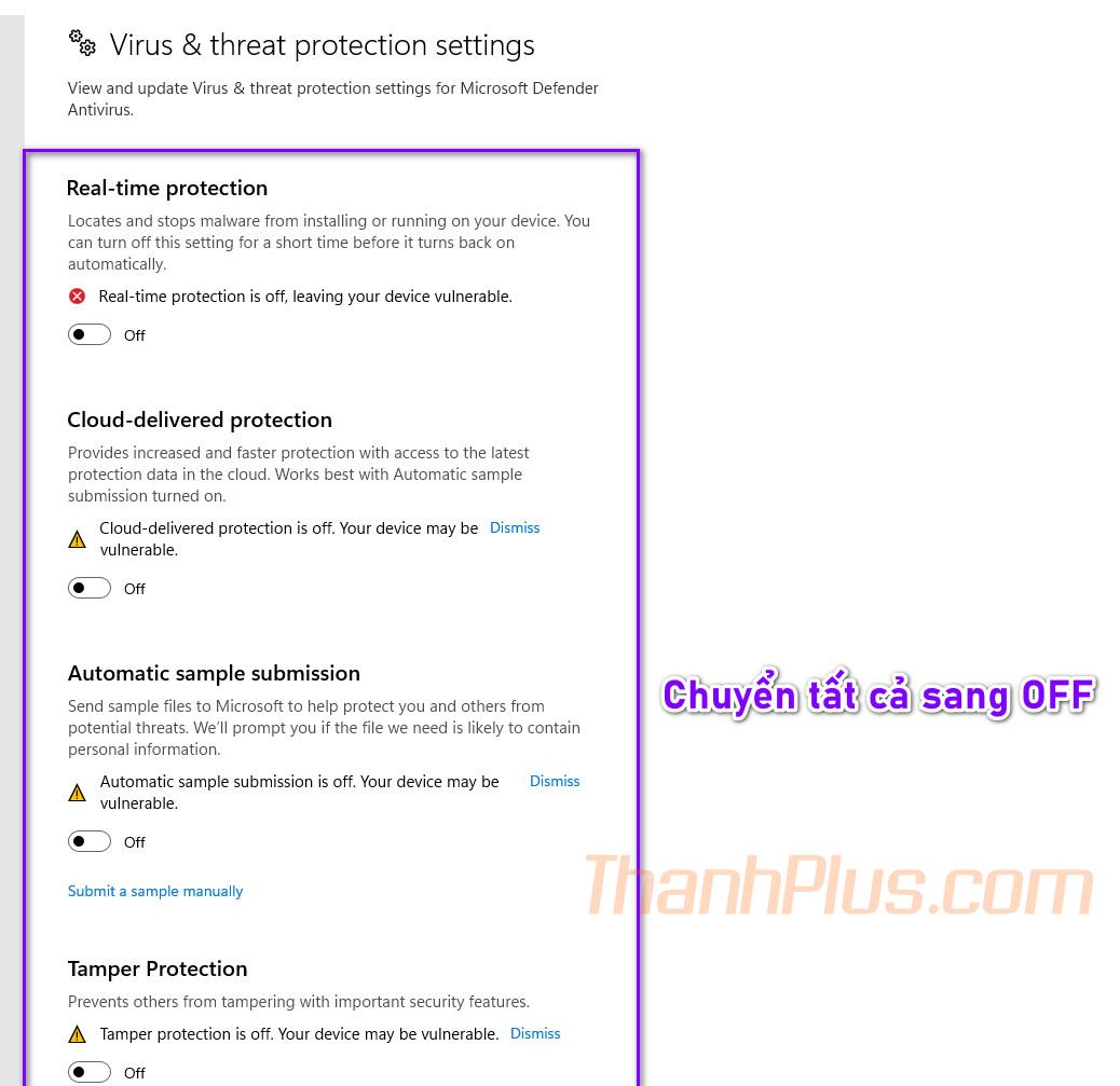 Tại bây bạn hãy click vào nút trạng thái để chuyển tất cả các mục sang trạng thái Off để tắt