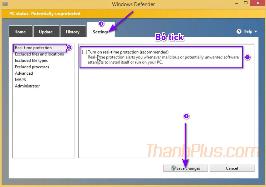 Tiếp theo hãy vào tab Settings > Real-time protection và bỏ tick ô như ảnh dưới sau đó chọn Save changes