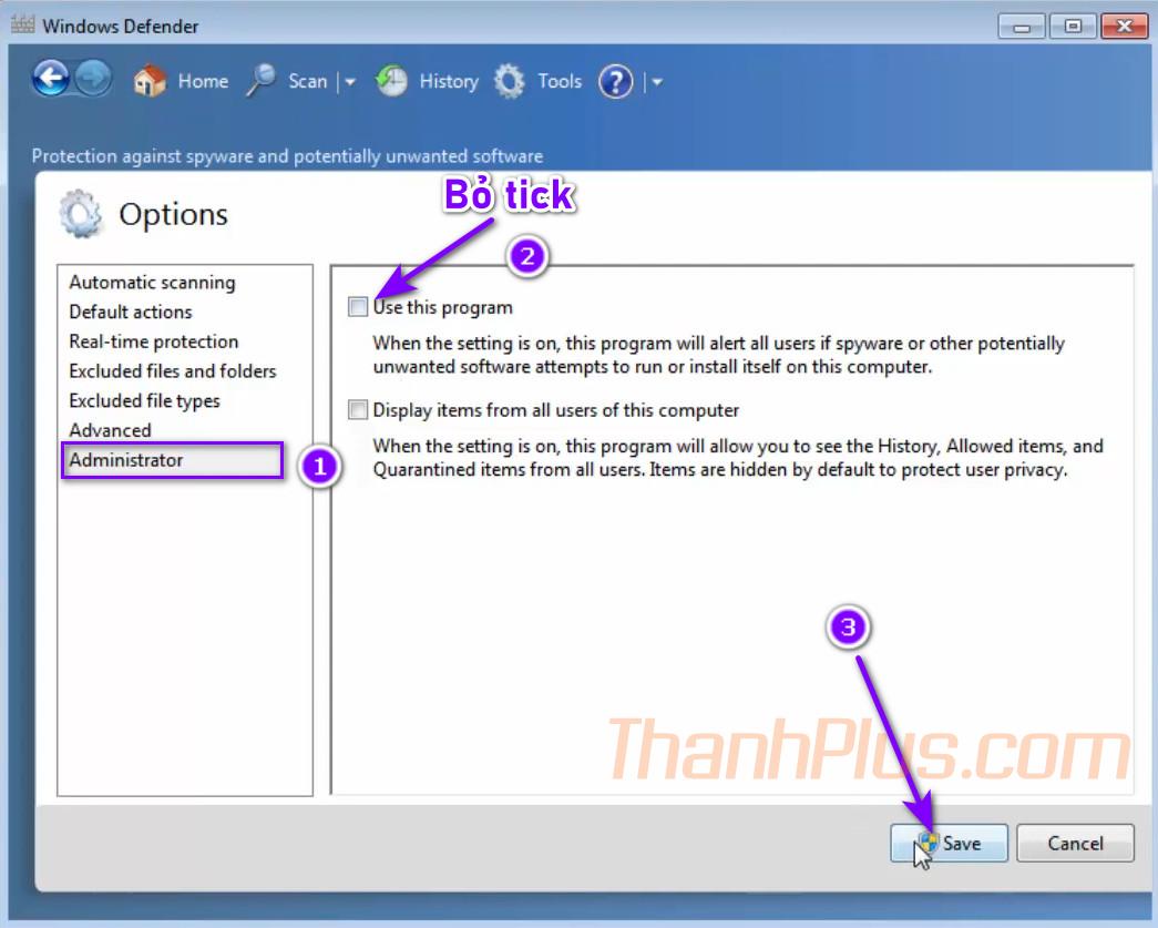Vào mục Administrator, bỏ tick ô Use this program và click Save để lưu lại
